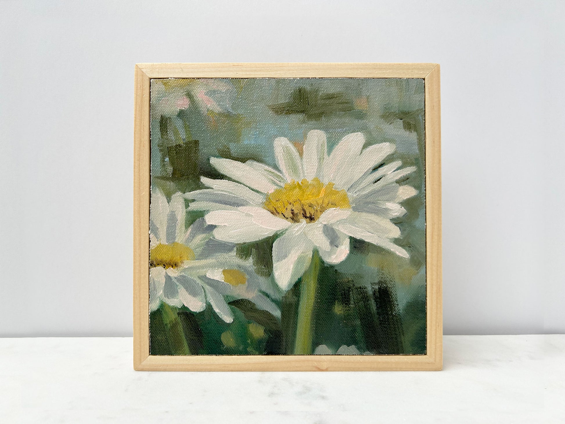April's birth month flower is the daisy. Painted by Maine artist, Sarah Cassani, this original oil painting on canvas is mounted on panel, and comes ready to hang in a low profile natural wood floater frame.