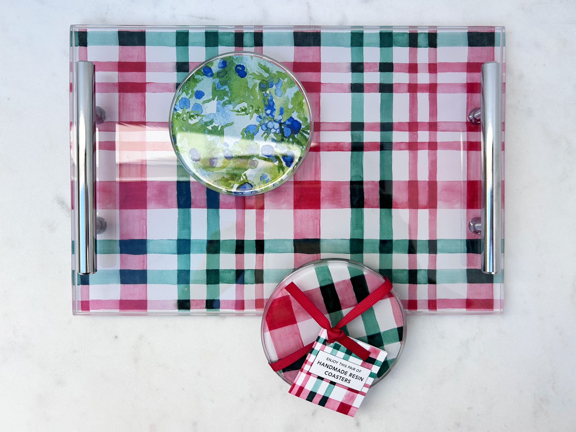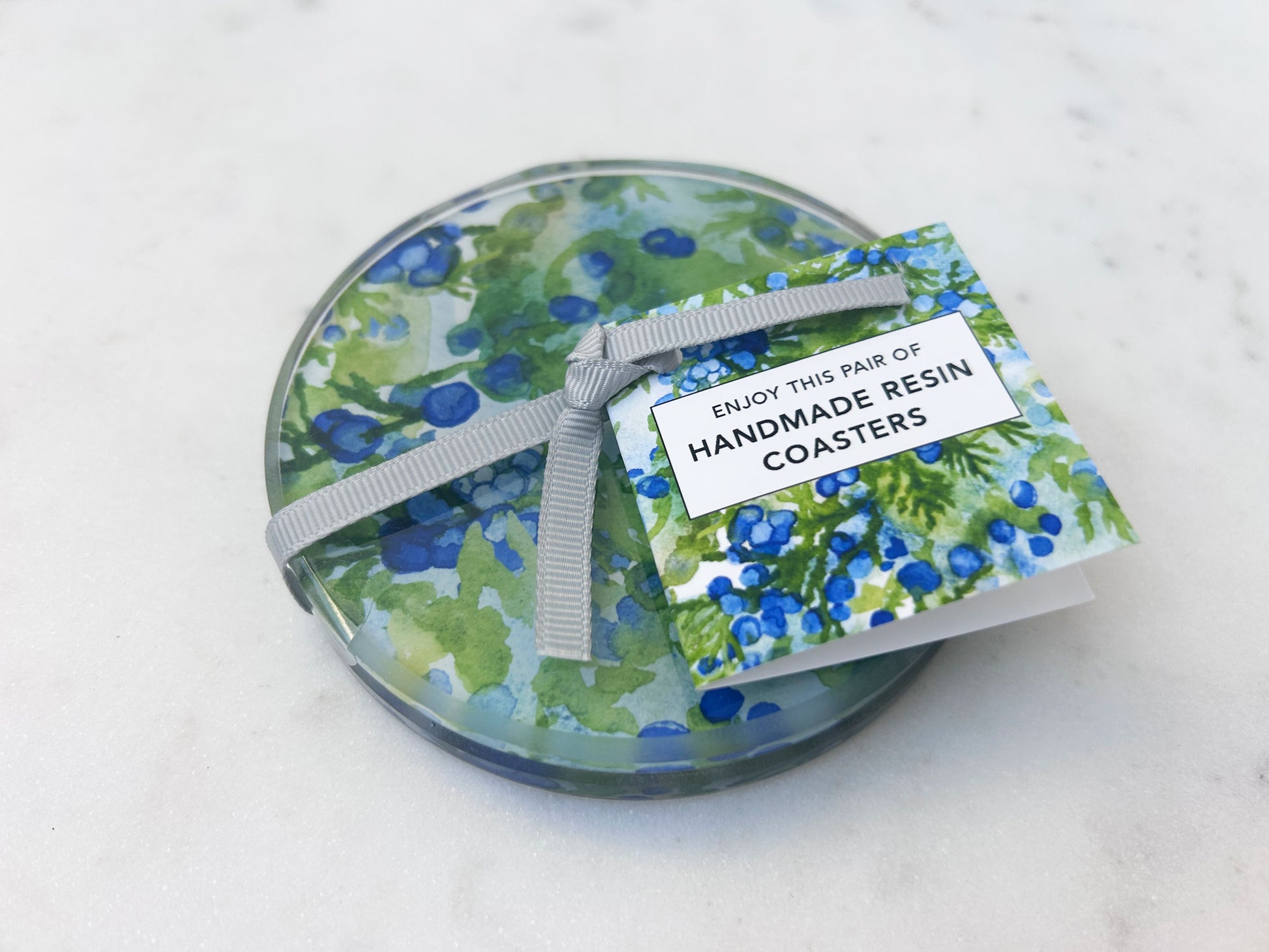 Elevate holiday drinks with this pair of unique hand crafted coasters in a winter juniper design.