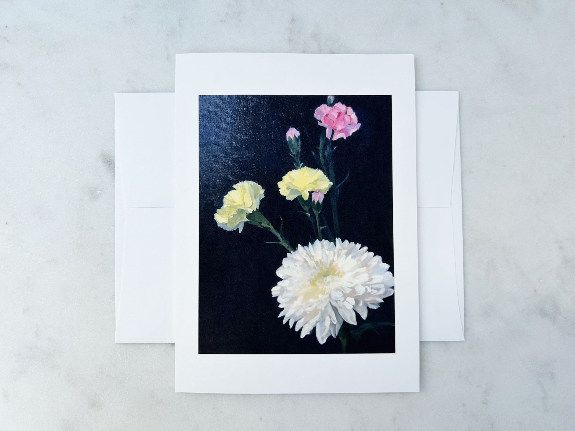 This notecard features Mum & Carnations, an original oil painting by Sarah Cassani.