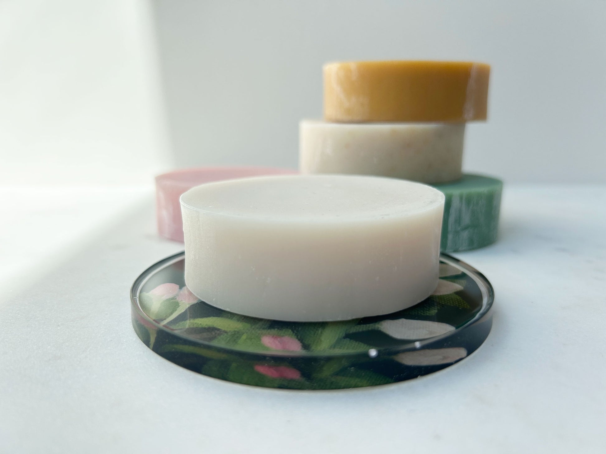 A one of a kind item! This handmade soap coaster is hand poured using high-quality resin, easy to clean and perfect for everyday use.